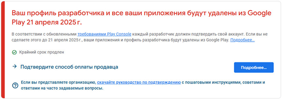 В конце 2024г команда Google разработчиков предъявила условия сохранения акаунта разработчика и приложений в их магазине. Одним из таких условий было подтверждение платежного профиля. Это условие в рамках санкций не выполнимо — РФ банки не проходят валидацию. Около 30 писем было написано и переписка ведется досихпор о том, что мы не можем выполнить этого условия по понятным причинам. Нас грозились удалить 20 марта, но этот срок был перенесен на 21 апреля 2025. Мы продолжаем отстаивать наш акаунт и приложение на их платформе.